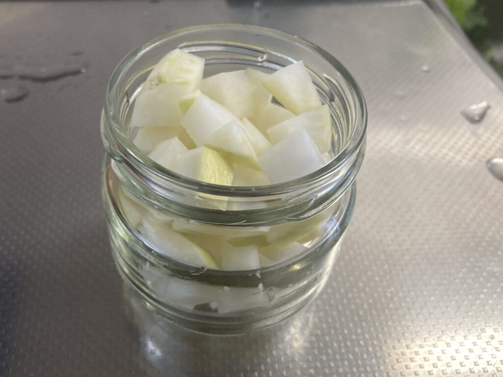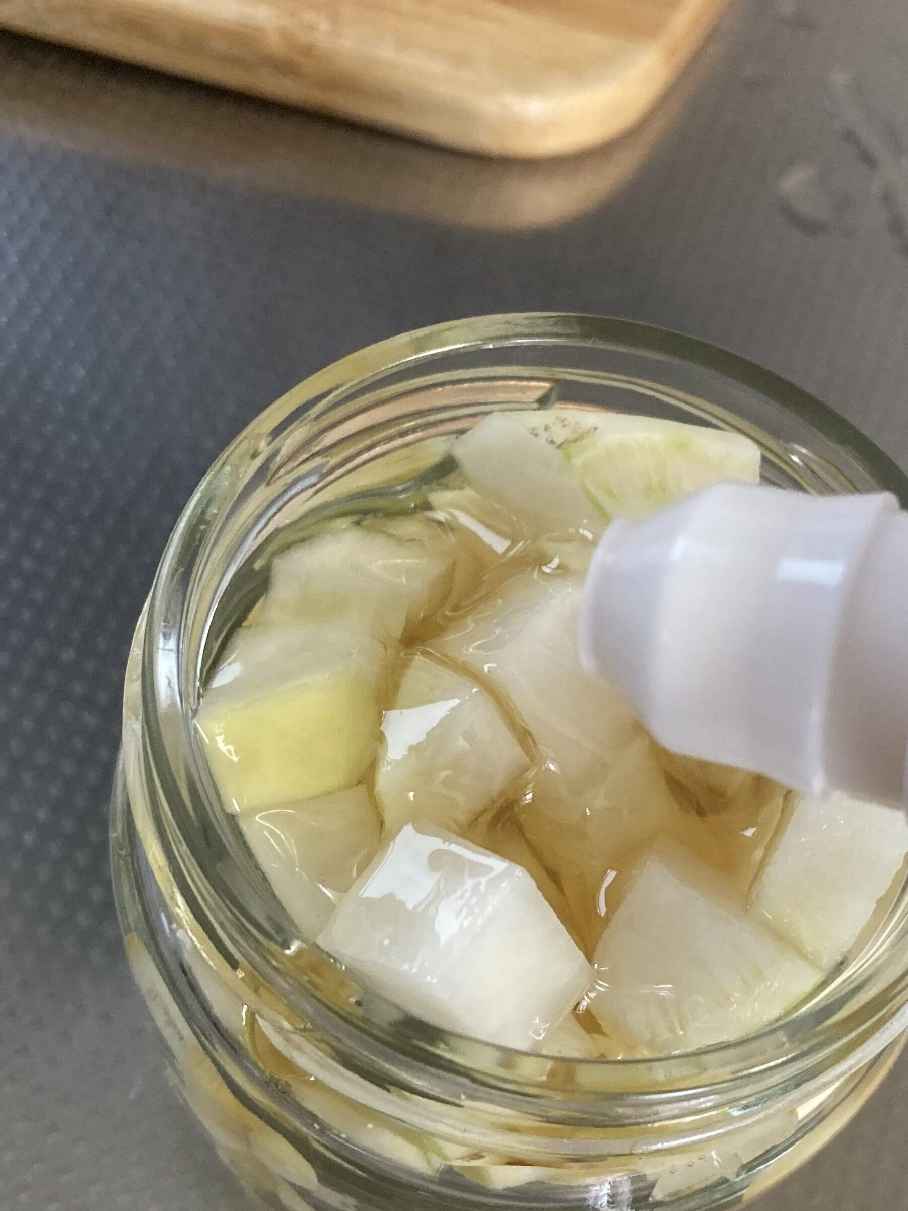 - 清潔な瓶に大根を入れ、はちみつをひたひたになるまで注ぐ。