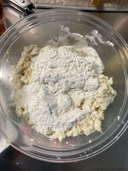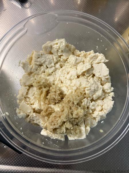 豆腐の1割量のおろし生姜を加え、つなぎとして小麦粉を混ぜます。